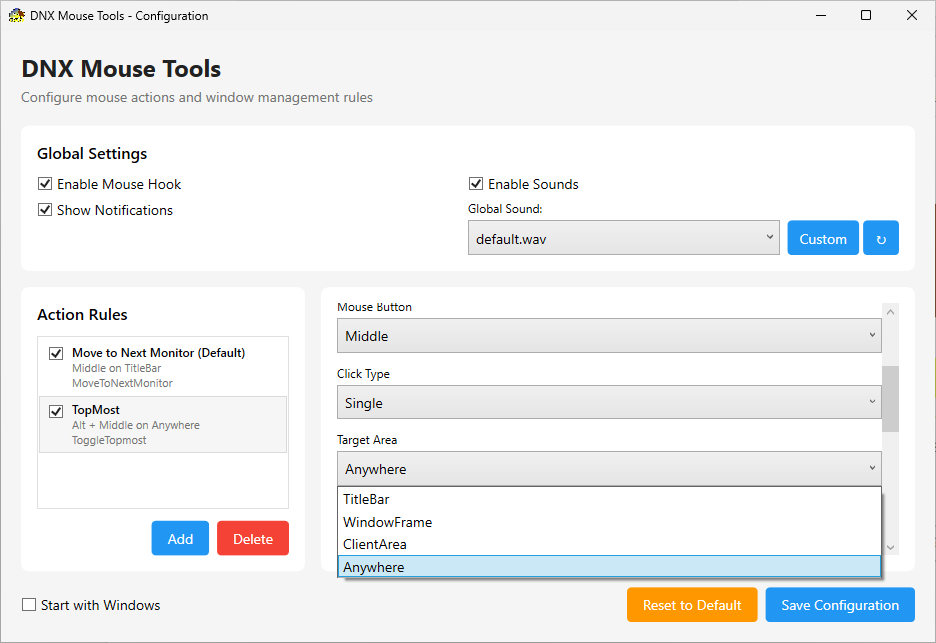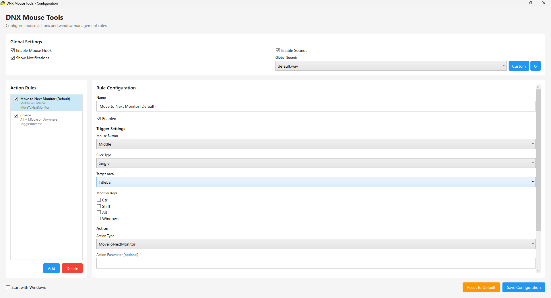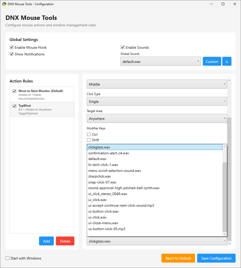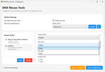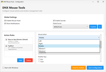- Fully Configurable Rules - Combine mouse buttons (left, right, middle, X1, X2) with modifiers (Ctrl, Shift, Alt, Win)