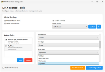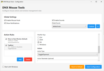 Managing windows across multiple monitors can be tedious. Dragging windows between screens, clicking tiny buttons to maximize or minimize, searching for the always-on-top option... DNX Mouse Tools solves this with customizable mouse actions.