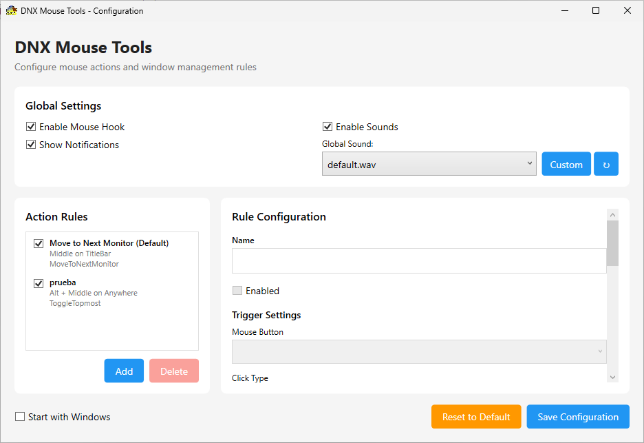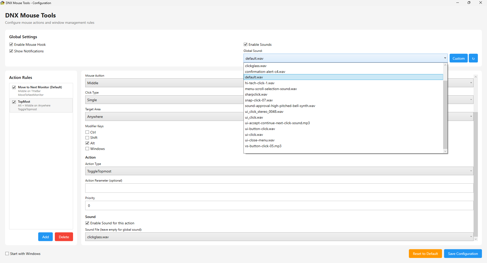 DNX Mouse Tools uses a low-level mouse hook to detect your configured actions. When you perform an action that matches a rule, the application executes the associated command.